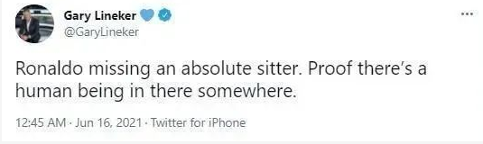 在比赛的上半场,葡萄牙在进攻端略显乏力,并没有收获进球。而C罗在上半场的发挥也没能达到最佳,更是遗憾错失了一次近乎空门的机会。随后,英格兰足球名宿莱因克尔在个人社交媒体上发文称:“C罗错失了一次近乎‘保姆球’的机会。这也证明他仅仅是个人类。”
