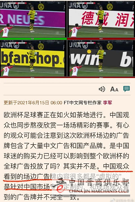 但这一消息,15日却被FT中文网一篇名为《眼见为虚——从足球赛的场边广告谈起》的文章“推翻”,该文称“中国观众看到的场边广告牌内容很多都是‘虚拟的’,是针对中国市场专门定制的,和现场观众看到的广告牌并不完全一致”。