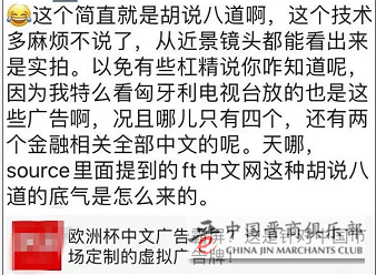 不过,“为中国市场定制”的说法引起了广泛质疑。有网友指出,从比赛的近景镜头都能看出来中文广告是实拍,匈牙利电视台放的也是这些广告。