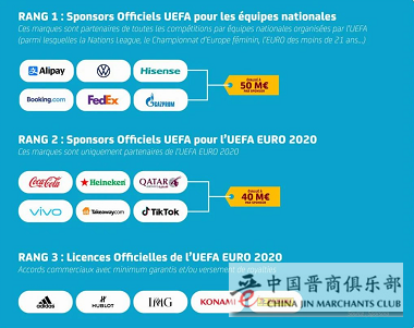 在欧足联官网公布的12家顶级赞助商中,中国企业占据4席,分别为海信、支付宝、vivo、TikTok,这些顶级赞助商享有的是全球范围内的曝光和传播权益。中国因此成为本届欧洲杯顶级赞助商最多的国家,历史上首次占据三分之一顶级赞助商席位。