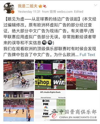 直到16日上午10时14分,@我是二姐夫 才承认“原有欧洲杯虚拟广告的部分经过查证,绝大部分中文广告为现场广告。有关德甲/西甲联赛应用虚拟广告部分无误。非常抱歉给读者带来的误导和不实信息”。