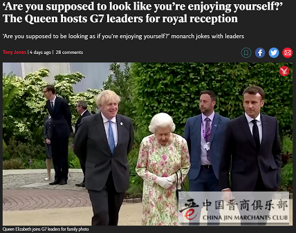 第二件事情,BBC录到了一段讲话,“超长待机”的英国女王跟各国领导人合照的时候,和首相鲍里斯·约翰逊讲了一段话,大概意思是“你们是不是假装很享受这种时刻”。她用那种恰好让所有人都能听到的耳语声这么说,然后所有人哈哈地在那儿笑。
