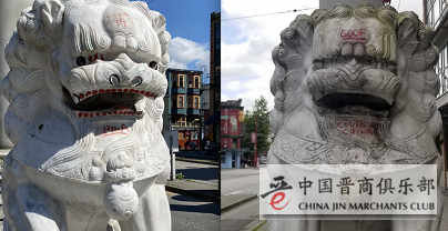 温哥华中国城石狮子去年被涂上种族主义词汇 图自推特