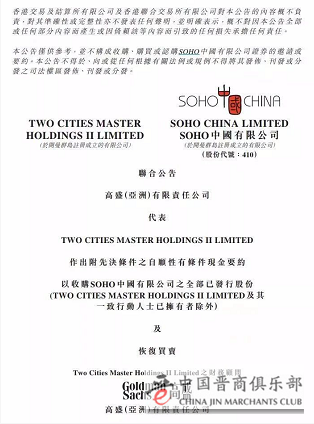 6月16日晚间,美国投资管理公司黑石集团(Blackstone,或称“百仕通”)公布,向SOHO中国发起全面要约收购,而SOHO中国则公布交易作价为236.6亿港元(约合人民币195亿元)。不过,在交易完成后,SOHO中国可以保持现有主营业务和管理团队,现股东潘石屹和张欣夫妇将保留9%的股份,并继续保持在香港的上市地位。
