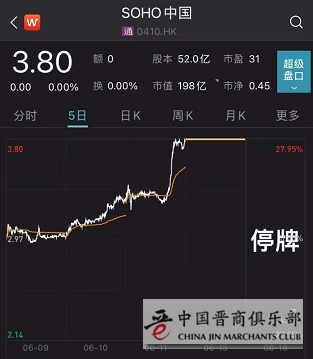 SOHO中国在上周亦即6月7日~11日的一个交易周中,股价连续爆升,累涨47.86%,最新市值抬高至197.58亿港元(折合约为25.5亿美元)。该股自6月15日上午起停牌至6月16日,将于17日恢复买卖。