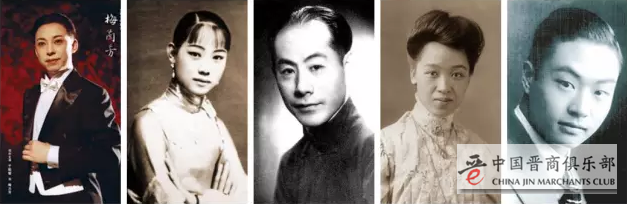 图:左起为梅兰芳、福芝芳、张伯驹、康同壁、程砚秋
