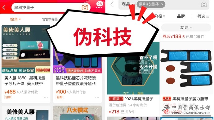 虽然中消协发布了消费警示,但解放日报·上观新闻记者以“黑科技 量子”为关键词在多家电商平台搜索发现,仍有大量“量子产品”,美容、减肥、健身类产品特别多,其中不少还参加电商平台的“6·18”大促。