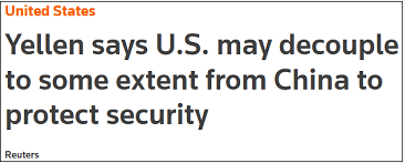 耶伦当天宣称,美国需要遏制中国的“恶性收购”,限制美企对一些中企的投资,以保护国家安全。路透社解读称,耶伦是在表示,美国预计会在某些领域与中国脱钩。不过,她对中美在技术领域脱钩表示了担忧,并称美国的许多盟友并不愿意(reluctant)大幅减少在中国的商业活动。