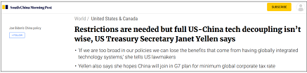 《南华早报》还提到,在技术领域,耶伦发表这番言论的一周之前,美国国会参议院表决通过了一项规模庞大、计划拨款超2500亿美元的“2021年美国创新和竞争法”(US Innovation and Competition Act of 2021),已应对中国的所谓“科技威胁”。