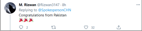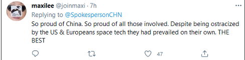 “真为中国感到骄傲,为所有参与其中的人感到骄傲。尽管被美国和欧洲封锁了太空技术,但中国还是靠自己的努力占据了上风。太棒了。”