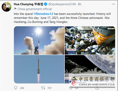 华春莹发布了四张神舟十二号任务图片,并发推写道:“进入太空!神舟十二号成功发射,历史会记住这一天——2021年6月17日,以及三名中国航天员——聂海胜、刘伯明和汤洪波。”