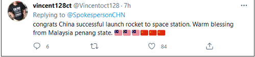一位马来西亚网友评论获得了最高的点赞数——“祝贺中国成功向空间站发射火箭,这是来自马来西亚的热切祝福。”