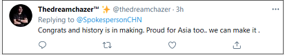 “恭喜,(中国)正创造历史。我为亚洲感到骄傲,我们可以做到。”