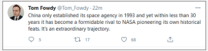 英国政治分析师汤姆·福迪(Tom Fowdy)也颇有感慨地写道,“中国在1993年才成立航天局,但在不到30年的时间里,中国正实现着自己的历史壮举,成为了NASA强劲的竞争对手。这是一个非凡的奇迹。”