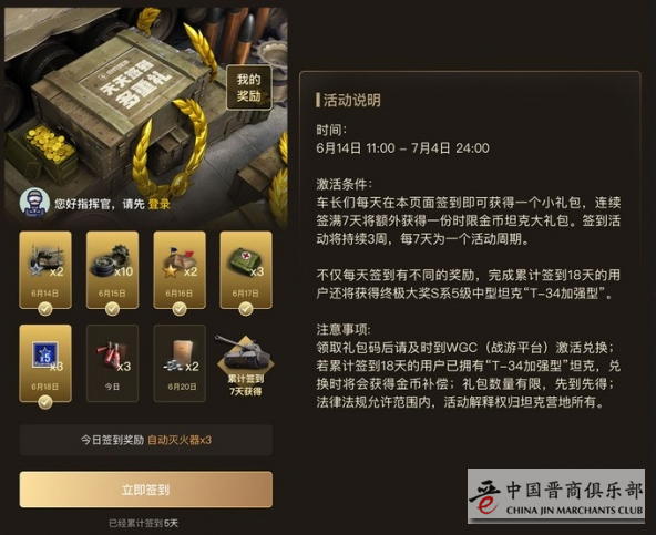 6月14日起,只要各位车长登录《坦克营地》参与签到活动即可获得礼包奖励!这些礼包奖励还可以叠加,每天签到即可每天领取!连续签到满7天、累计签到18天都将获得阶段性大礼包。连续签到满7天的车长将会额外获得一份限时金币坦克大礼包,而完成累计签到18天的车长还将获得终极大奖S系5级中型坦克“T34-加强型。”