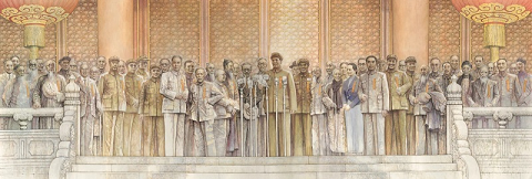 展览中,另一件让我们心潮澎湃、久久无法平静的作品便是赵建成先生《开国大典》,作品描绘了1949年10月1日中华人民共和国中央人民政府成立时天安门国庆典礼的盛况。作品还原那个决定中国未来走向的时刻、那影响四万万同胞命运的时刻、那无数先烈用鲜血浇筑的时刻,是共和国成立的艺术见证。