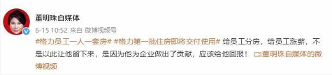 6月15日,据@董明珠自媒体 消息,董明珠答应送给员工的3000多套房即将交付使用,表示给员工分房,给员工涨薪,不是以此让他留下来,是因为他为企业做出了贡献,应该给他回报。