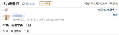 对于格力电器的员工持股计划,股吧网友炸开了锅,网友表示羡慕,“27(块)我也想买一千股”。