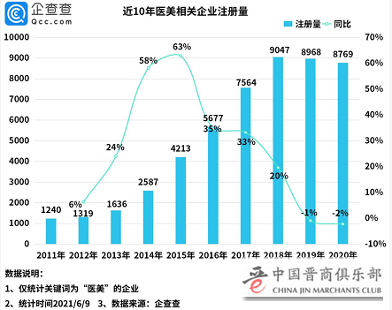 数据显示,近10年来我国医美相关企业年注册量总体呈波动下降趋势,2015年增速是近10年来最快的,同比增长63%。2018年数量为历年来最高,达9047家。2019年注册量略有下降,新增8968家,同比下降1%。2020年注册量达8769家,同比下降2%。