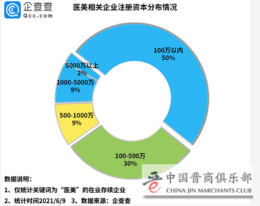 从注册资本来看,图表显示,我国8成的医美相关企业注册资本在500万以内,其中50%注册资本在100万以内,另有30%的企业注册资本在100-500万,而注册资本在5000万以上的则占总量的2%。