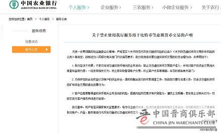 中国农业银行网站发布公告称,农业银行坚决不开展、不参与任何与虚拟货币相关的业务活动,禁止涉及虚拟货币交易客户准入,并将对客户及资金交易加大排查和监测力度。一经发现相关行为,将立即采取暂停账户交易、终止客户关系等措施,并及时报告有关部门。
