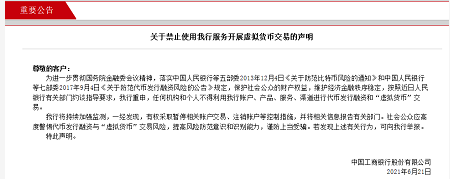 中国工商银行网站公告称,任何机构和个人不得利用工商银行账户、产品、服务、渠道进行代币发行融资和“虚拟货币”交易。