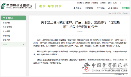 中国邮政储蓄银行网站发布公告称,任何机构和个人不得利用邮储银行账户、产品、服务、渠道进行代币发行融资和“虚拟货币”交易。