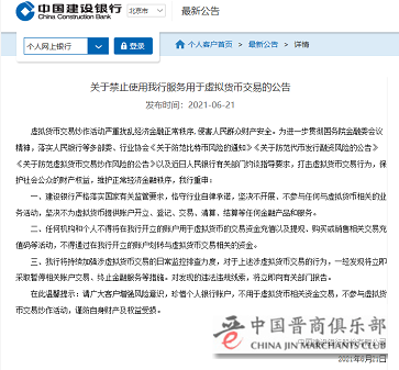 中国建设银行网站发布公告称,建设银行严格落实国家有关监管要求,恪守行业自律承诺,坚决不开展、不参与任何与虚拟货币相关的业务活动,坚决不为虚拟货币提供账户开立、登记、交易、清算、结算等任何金融产品和服务。