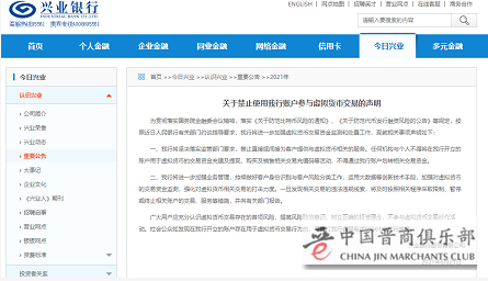 兴业银行网站发布公告称,兴业银行将坚决落实监管部门要求,禁止直接或间接为客户提供与虚拟货币相关的服务。任何机构与个人不得将在兴业银行开立的账户用于虚拟货币的交易资金充值及提现、购买及销售相关交易充值码等活动,不得通过兴业银行账户划转相关交易资金。
