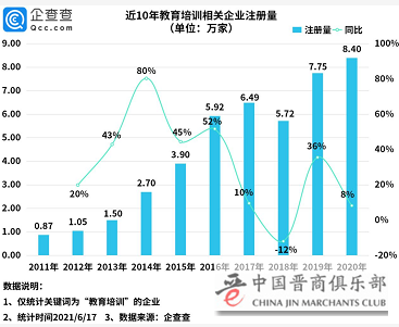 数据显示,近10年教育培训相关企业注册量总体呈波动增长趋势,2014年增长率达10年来最高,同比增长80%,新增2.7万家。2018年注册量略有下降,达5.72万家,同比下降12%。2019、2020年注册量回升,2020年注册量达10年来最高,共新增8.4万家,同比增长8%。截至6月17日,2021年已新增5.43万家相关企业。