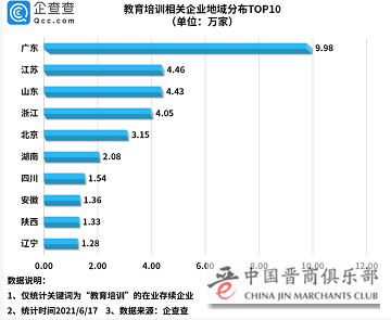数据显示,广东省拥有的教育培训相关企业数量最多,达9.98万家。江苏、山东,分别以4.46万家和4.43万家位列二三位。