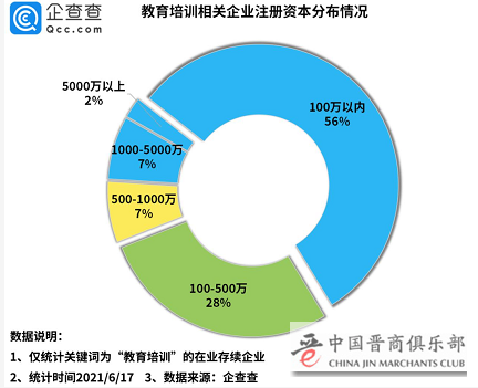 从注册资本上看,数据显示,我国超8成的教育培训相关企业注册资本在500万以内,其中56%的企业注册资本在100万以内,28%的企业注册资本在100-500万这个区间,注册资本在5000万以上的,则占总量的2%。