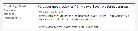 当地时间6月22日,瑞典斯德哥尔摩行政法院在其官网发布了一则声明,对外说明了有关华为上诉瑞典政府的有关判决情况。