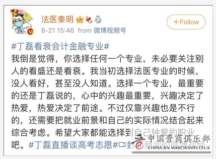 @法医秦明 也参与讨论称,“选择任何一个专业,未必要关注别人的看盛还是看衰”。@法医秦明 表示,自己当初选择法医专业的时候,没人看好,甚至没人知道。选择一个专业,兴趣最重要,兴趣决定了热爱,热爱决定了前途。不过仅靠兴趣也是不行的,还需要把就业前景和自己的实际情况结合起来综合考虑。