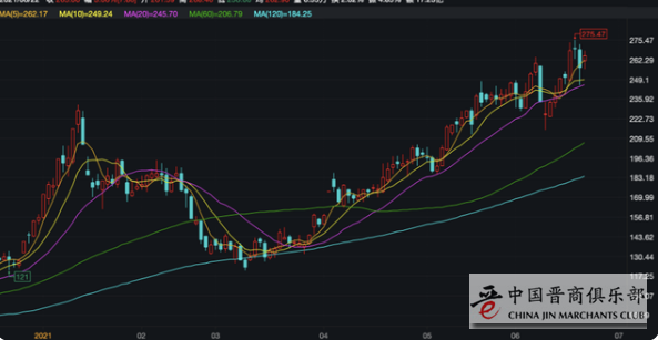 从K线数据来看,本轮酒鬼酒行情发动始自今年3月9日,在之后的60个交易日,其股价虽偶有回调,但不改上扬行情。进入6月以来,白酒板块多次回调。6月8日,酒鬼酒股价收于跌停板;但随后稍作整理,继续上攻;6月18日,其股价一度上冲至历史新高275.47元/股,总市值近900亿元,股价较3月9日低点上涨幅度高达128%。