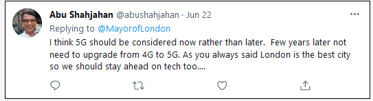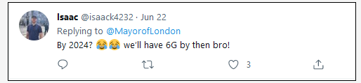 在吐槽的同时,也有网民认真地给市长萨迪克·汗提出了建议:“我认为应该现在而不是以后再考虑5G,这样数年后就不用从4G升级到5G了。正如你总说的那样,伦敦是最棒的城市,所以我们也应该在技术上保持领先......”