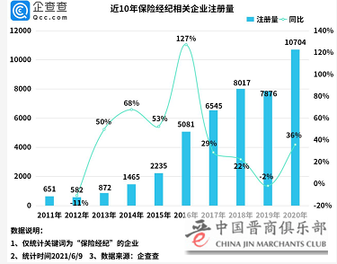 数据显示,2010-2015年年均注册量达1161家,自2016年开始,保险经纪市场规模进一步扩大。2016年增长率达10年来最高,同比增127%,新增5081家。2019年注册量略有下降,达7876家,同比下降2%。2020年注册量达10年来最高,共新增1.07万家,同比增长36%。截至6月9日,2021年已新增6065家相关企业。