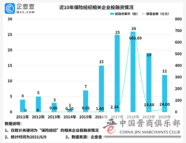 从投融资来看,数据显示,近10年我国保险经纪行业共发生121起投融资事件,披露总投融资金额超727亿元。其中,2018年投融资事件和披露投融资金额为历年来最高,共发生26起投融资事件,披露金额超668亿元。2019年、2020年逐年下降,投融资事件分别为19起和12起,披露投融资金额分别为19亿元和24亿元。截至目前(6月9日),2021年保险经纪赛道共发生了4起投融资事件,披露投融资金额超10亿元。