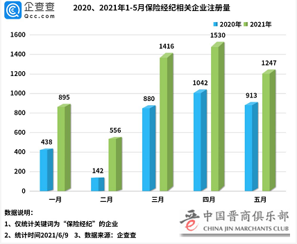 互联网保险的崛起,离不开保险经纪产业的发展,企查查数据显示,目前我国共有4.6万家保险经纪相关企业,江苏、广东和山东分别以4959家、4513家和4087家位列前三。从注册量上来看,2020年相关企业新增注册量1.07万家,同比增长36%,2021年1-5月我国新增5644家相关企业,同比增长65%。