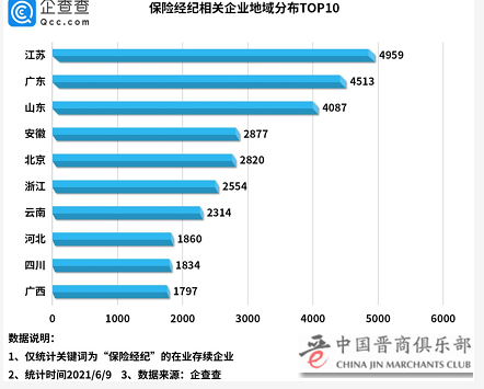 从地区分布来看,数据显示,江苏省拥有的保险经纪相关企业数量最多,达4959家。广东、山东、安徽以及北京,分别以4513家、4087家、2877家和2820家位列前5。