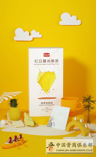 其包装的配色偏向女性的喜好,产品本身还加入了菠萝雪梨水果片,这些被女性偏爱的原料。而在产品设计上,采用透明三角包的形式,能够清晰地透过茶包,看到里面颗颗分明的薏米和红豆,所见即所得,不但让原料真实可见,还丰富了口感。