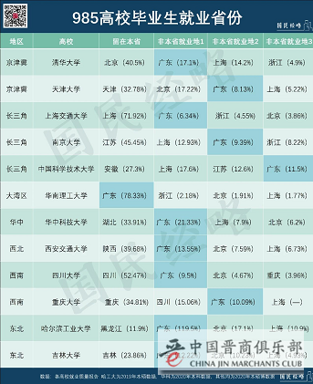 超过20%的华中科技大学毕业生、超过19%的哈工大的毕业生,超过17%的清华大学毕业生、超过13%的西安交通大学毕业生,均选择广东作为主要就业地。
