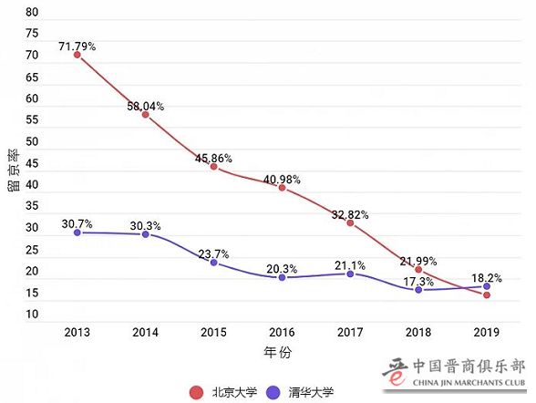 值得一提的是,清华北大毕业生的留京比例整体也不足50%,而且呈现下降之势。
