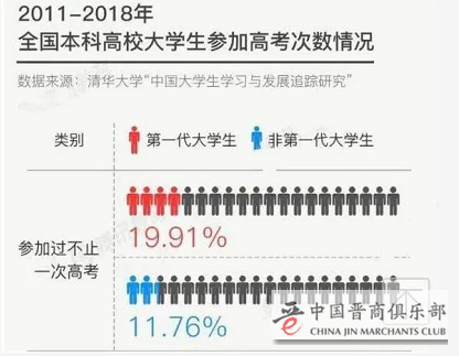 与此同时,与非第一代大学生相比,更多的第一代大学生参加过多次高考(即复读),占比达到19.91%。