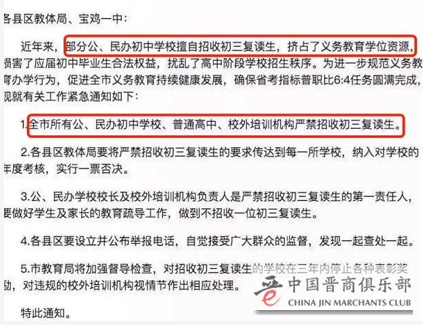 2019年,陕西宝鸡教育局就出台文件,禁止初中毕业生复读中考。这个禁令不单单针对公办学校,还包括了所有的民办初中、普通高中、校外培训机构,可谓一网打尽。
