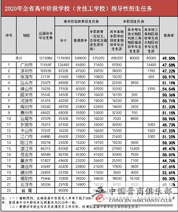 2020年广东省高中阶段学校(含技工学校)指导性招生任务,全省普高率为49.50%,普职比例十分均衡。