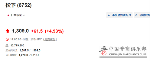 但是投资者们却认为这是一个重大利好。在6月25日的东京股市上,松下股价大涨近4.93%,升破1300日元,总市值3万亿日元(约合人民币1750亿元)。