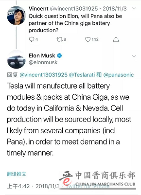 2018年11月,在确定了中国工厂已经实质性落地上海临港之后,马斯克通过twitter表示,中国工厂的电芯将由包括松下在内的几家公司本土化供应,为的是尽快实现投产。
