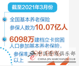 最新数据显示,截至2021年3月份,全国基本养老保险参保人数为10.07亿人。6098万建档立卡贫困人口参加基本养老保险,参保率稳定在99.99%以上,基本实现应保尽保。