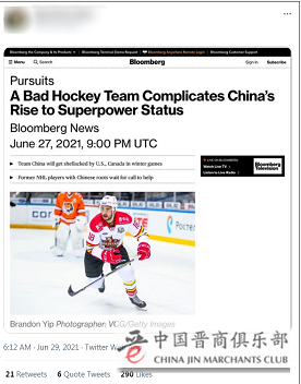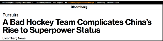 彭博社这篇文章的题目为:“一支表现不佳的冰球队,会使中国崛起的进程复杂化”。文章一开始就以己之心度人之腹,宣称“中国在2008年举办北京奥运会之时,曾把获得奖牌当做国家的优先任务,使之与全球大国的身份相称”,试图借此来暗示明年的冬奥会。